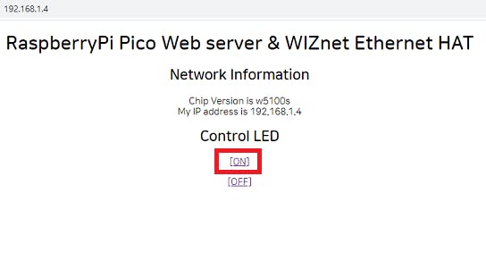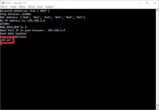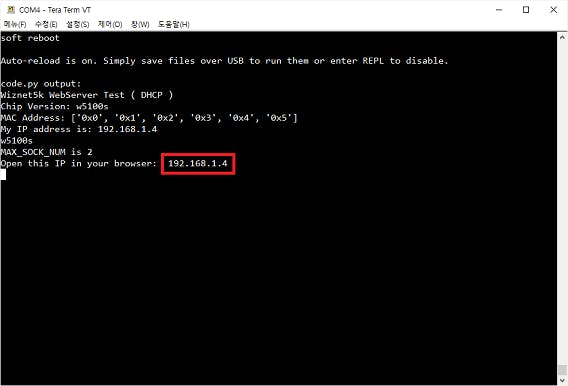 웹 페이지를 열고 192.168.1.4를 입력하면 다음과 같은 페이지가 나타한다. 페이지에 접속하게 되면 연결된 서버의 IP 주소와 위즈넷 칩 버전을 확인할 수 있다.