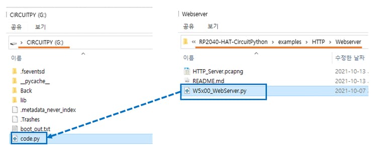 WIZnet github에 접속하여 CircuitPython WebServer 소스를 가져와 피코 내부에 있는 code.py에 복사한다.