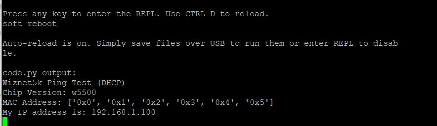 import board import busio import digitalio import time from adafruit_wiznet5k.adafruit_wiznet5k import WIZNET5K SPI1_SCK = board.GP10 SPI1_TX = board.GP11 SPI1_RX = board.GP12 SPI1_CSn = board.GP13 W5500_RSTn = board.GP15 print("Wiznet5k Ping Test (no DHCP)") # Setup your network configuration below # random MAC, later should change this value on your vendor ID MY_MAC = (0x00, 0x01, 0x02, 0x03, 0x04, 0x05) IP_ADDRESS = (192, 168, 0, 100) SUBNET_MASK = (255, 255, 0, 0) GATEWAY_ADDRESS = (192, 168, 0, 1) DNS_SERVER = (8, 8, 8, 8) led = digitalio.DigitalInOut(board.GP25) led.direction = digitalio.Direction.OUTPUT ethernetRst = digitalio.DigitalInOut(W5500_RSTn) ethernetRst.direction = digitalio.Direction.OUTPUT # For Adafruit Ethernet FeatherWing cs = digitalio.DigitalInOut(SPI1_CSn) # For Particle Ethernet FeatherWing # cs = digitalio.DigitalInOut(board.D5) spi_bus = busio.SPI(SPI1_SCK, MOSI=SPI1_TX, MISO=SPI1_RX) # Reset W5500 first ethernetRst.value = False time.sleep(1) ethernetRst.value = True # Initialize ethernet interface with DHCP # eth = WIZNET5K(spi_bus, cs) # Initialize ethernet interface without DHCP eth = WIZNET5K(spi_bus, cs, is_dhcp=False, mac=MY_MAC) # Set network configuration eth.ifconfig = (IP_ADDRESS, SUBNET_MASK, GATEWAY_ADDRESS, DNS_SERVER) print("Chip Version:", eth.chip) print("MAC Address:", [hex(i) for i in eth.mac_address]) print("My IP address is:", eth.pretty_ip(eth.ip_address)) while True: led.value = not led.value time.sleep(1) print("Done!") |