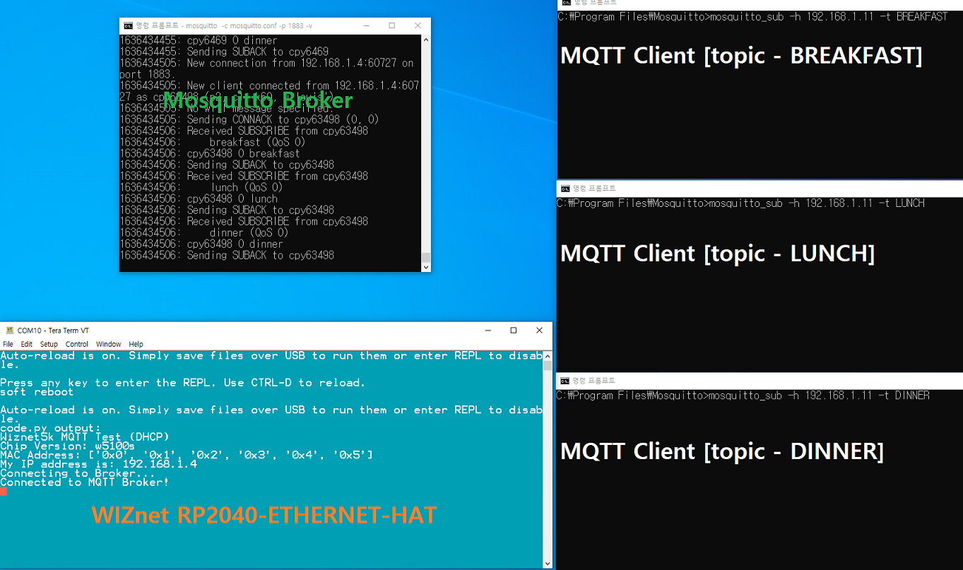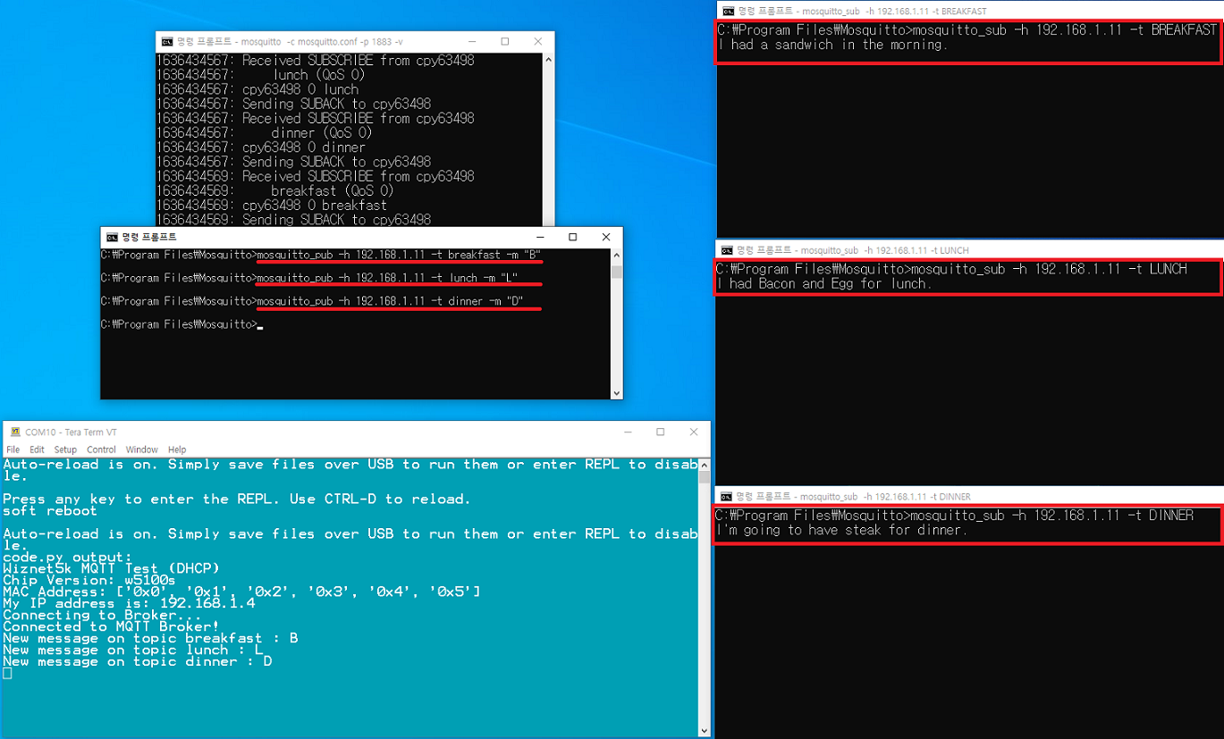 3. Command Prompt를 열어 [Mosquitto Broker]를 실행하고 [Teraterm Terminal]을 열어 피코를 실행한다.