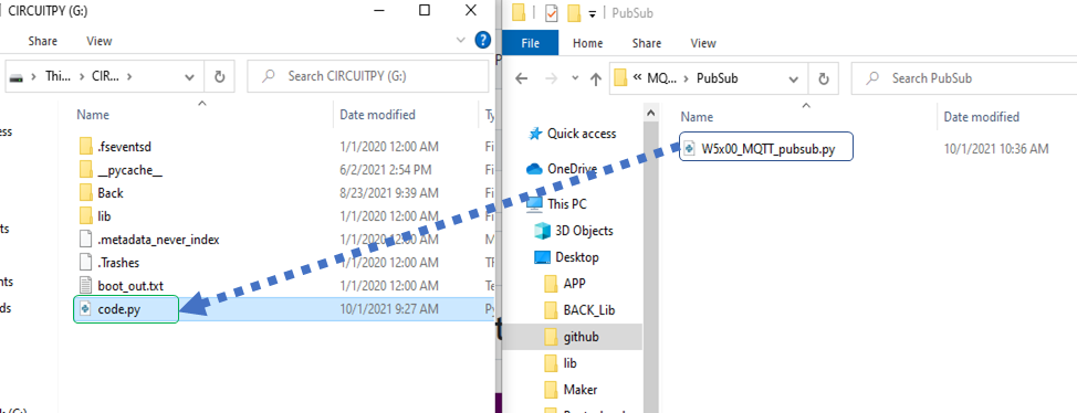 2. examples/MQTT/PubSub/W5x00_MQTT_pubsub.py 파일을 피코에 있는 code.py에 가져온다.