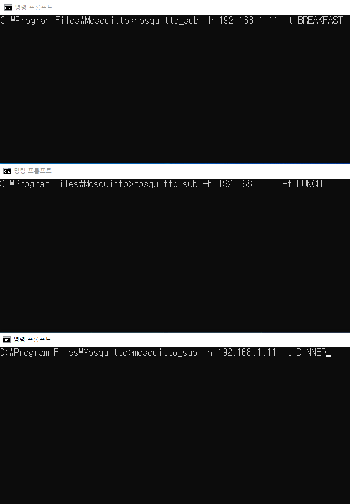 C:\Program Files\Mosquitto>mosquitto_pub -h 192.168.1.11 -t breakfast -m "B"
